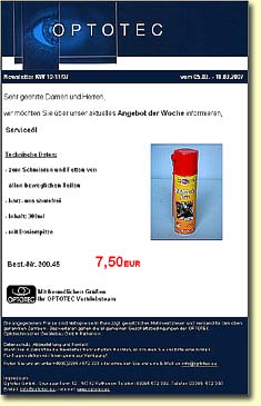 Für unsere Kundinnen und Kunden versenden wir einen wöchentlichen Newsletter. Hierin gibt es immer ganz verschiedene Aktionsangebote zu sehr attraktiven Konditionen - Sie können sich hier für diesen Newsletter eintragen. Er wird Ihnen dann wöchentlich per E-Mail zugesandt.